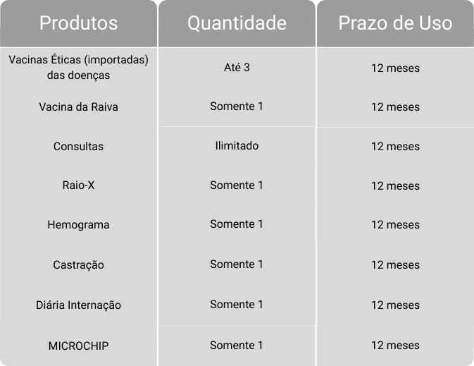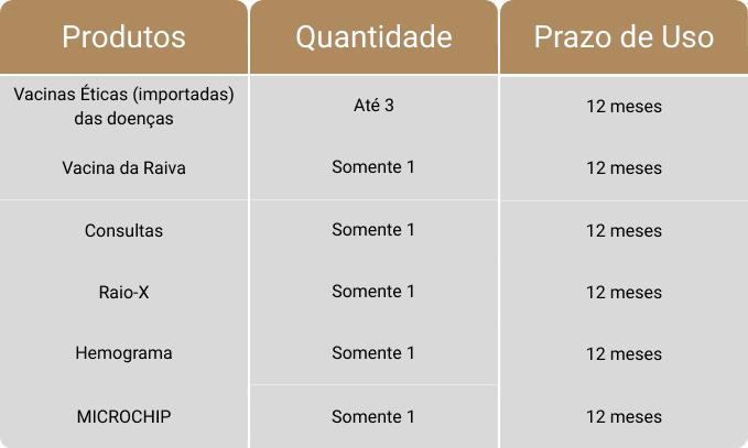 *Vacinas não incluem da Gripe e Giardia
